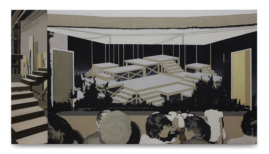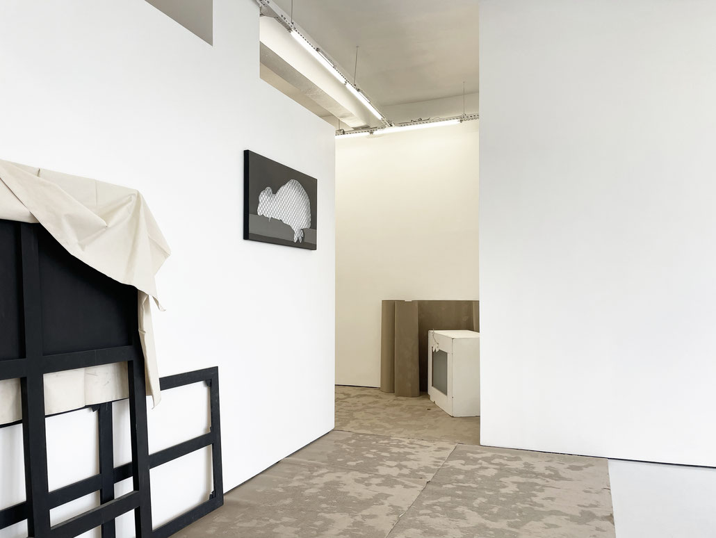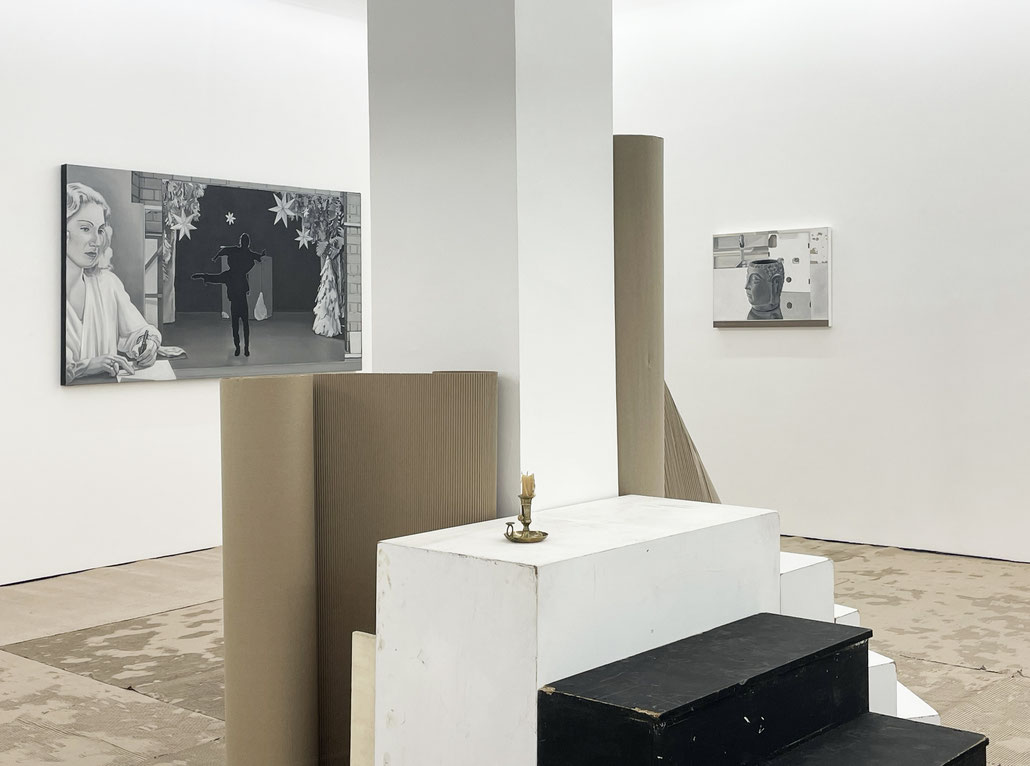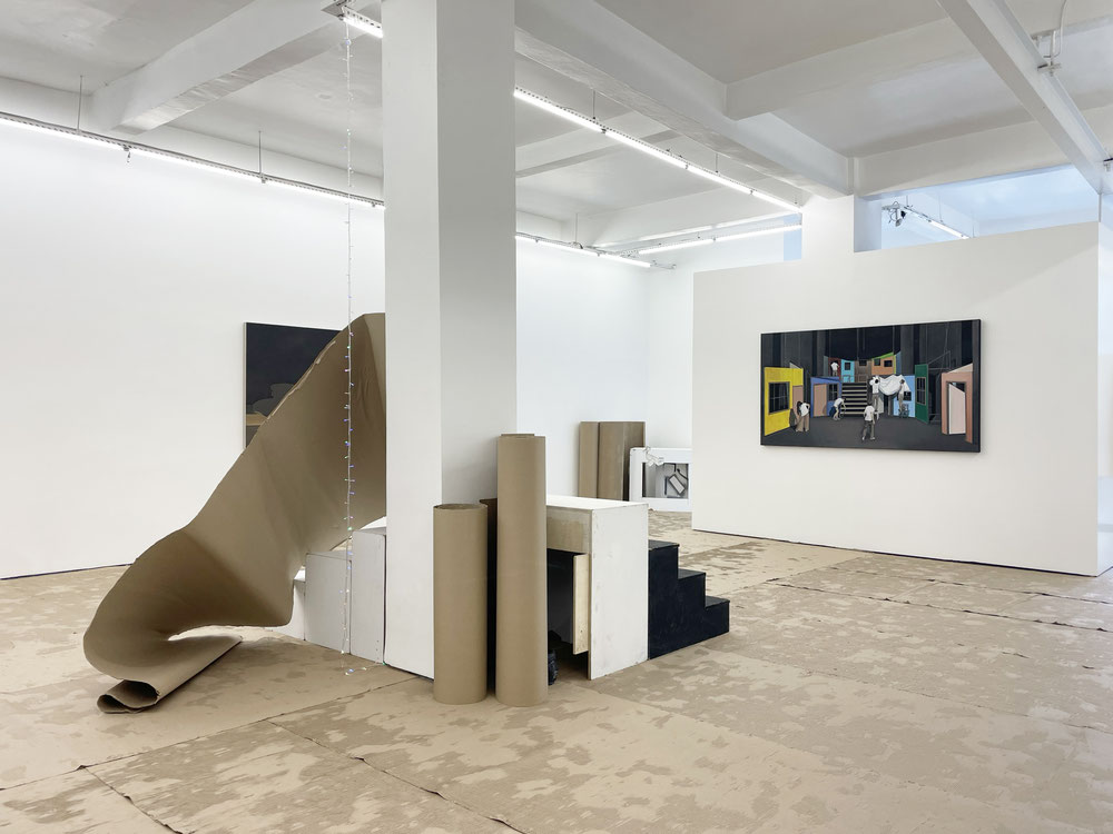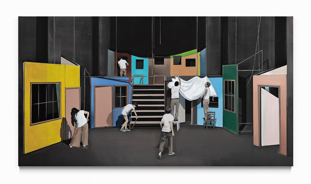 structures from the theatre, Leylâ Gediz’s exhibition opens up a space of translation between the processes of painterly composition and those underlying a set change. In theatrical performance, the curtain conceals a flurry of activity between acts, as one world of painted backdrops, furniture, rigging, and props is