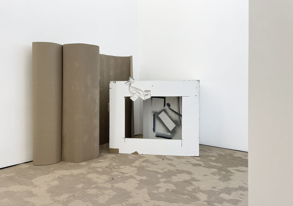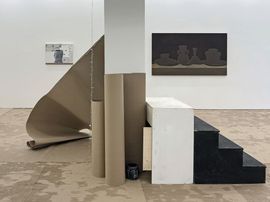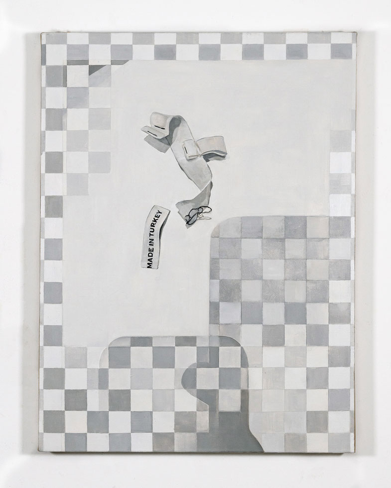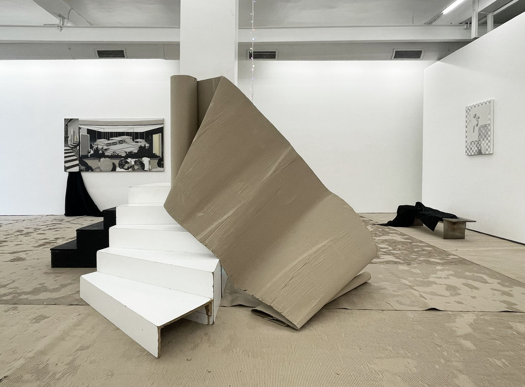 structures from the theatre, Leylâ Gediz’s exhibition opens up a space of translation between the processes of painterly composition and those underlying a set change. In theatrical performance, the curtain conceals a flurry of activity between acts, as one world of painted backdrops, furniture, rigging, and props is